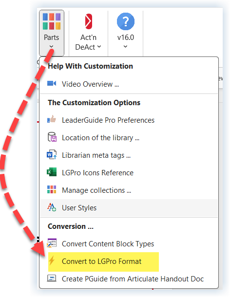 Click Convert to LGPro Format tin the Parts button drop-down menu