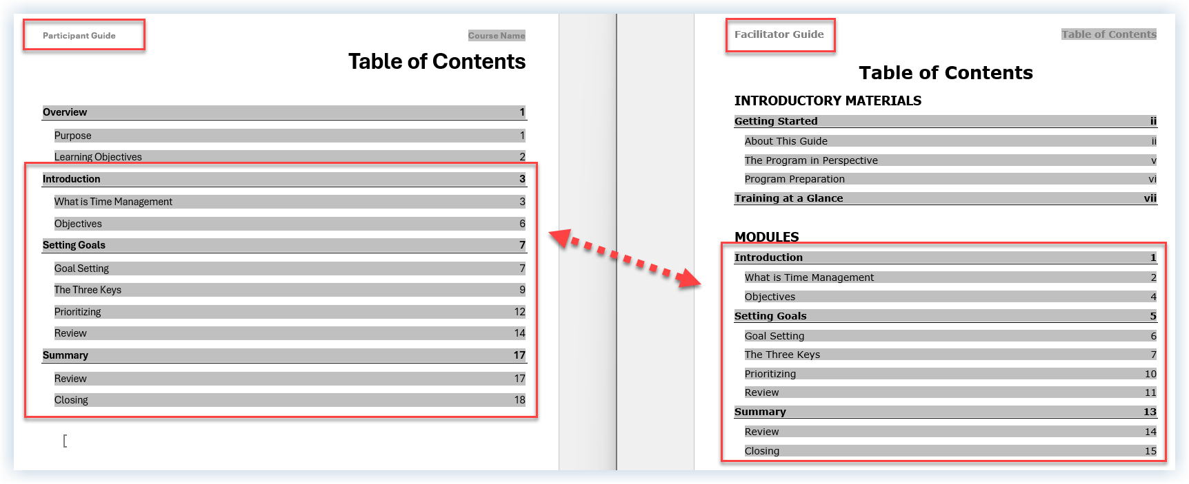 Compare the Table of Contents in your Participant Guide to the Table of Contents in your Facilitator Guide