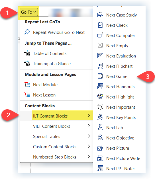Use the Go To function in the Controls group on the ribbon to go from one occurrence of a specific block type to the next.