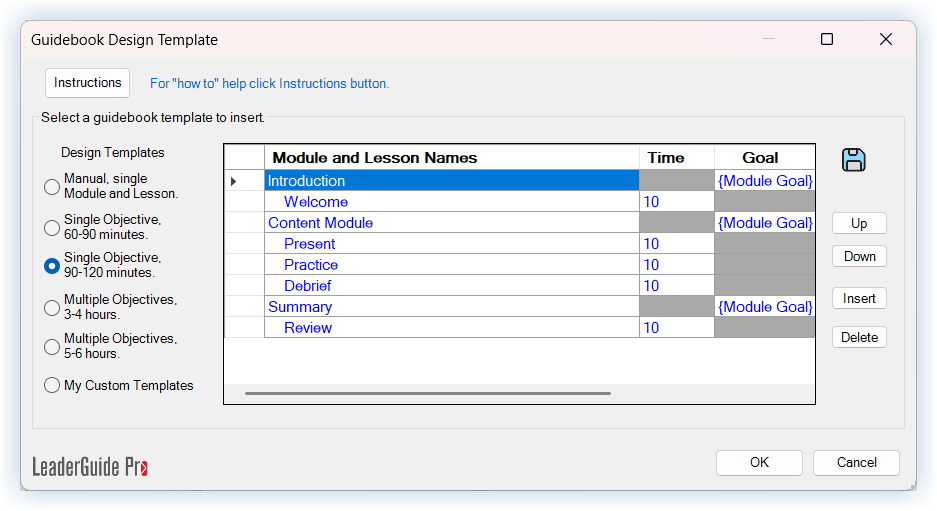 IMPORTANT: Click Cancel in the lower right corner of the Design Template dialog box to close out of the Design Template without adding Modules and Lessons to the end of the open guidebook on your screen