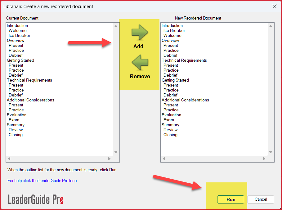 Click RUN in the lower right corner of the dialog box to create your new, reordered guidebook