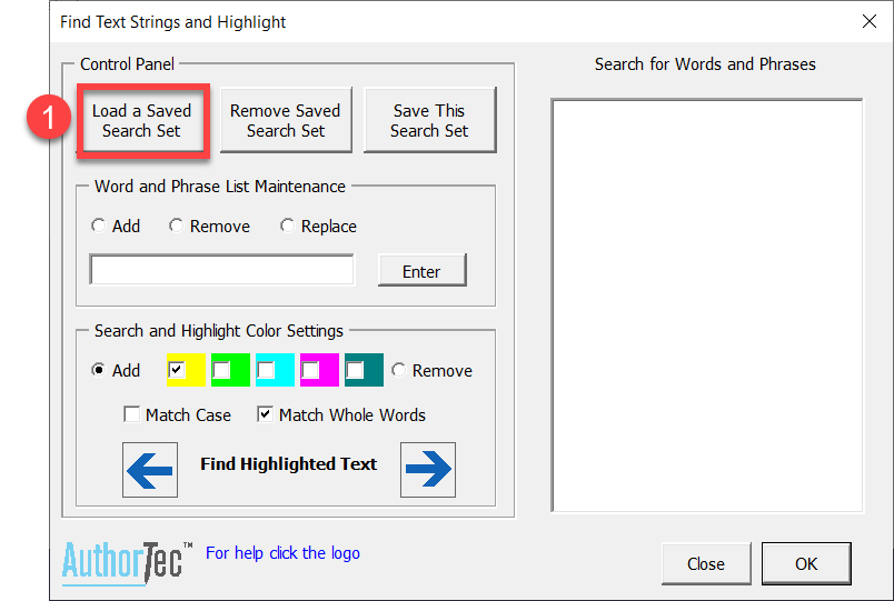1. You will now see the list of search terms in the AuthorTec Find and Highlight dialog.